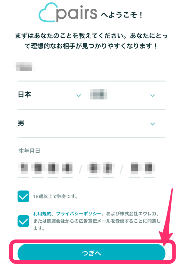 それからは、順に表示される必要項目をサクサクッと設定するだけで、他の方法と同じようにペアーズへの無料登録が完了。
